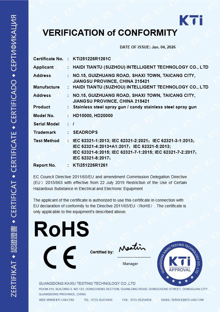 海滴天涂糖果喷枪采用专利低压高雾化技术,精准喷涂,节省30%-50%的喷油量。316不锈钢枪体耐腐蚀,设计小巧(宽2cm,高10.16cm),适合密集安装,解决糖果表面麻点问题。